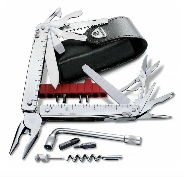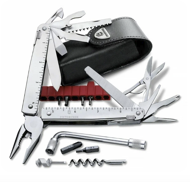 Корпус и инструменты с выверенной геометрией и жёсткой фиксацией. Нож, пила, ножницы, напильник, острогубцы, съёмные биты — каждый элемент выполняет свою функцию на 100% и выдерживает нагрузку. Никаких люфтов, никаких заеданий.