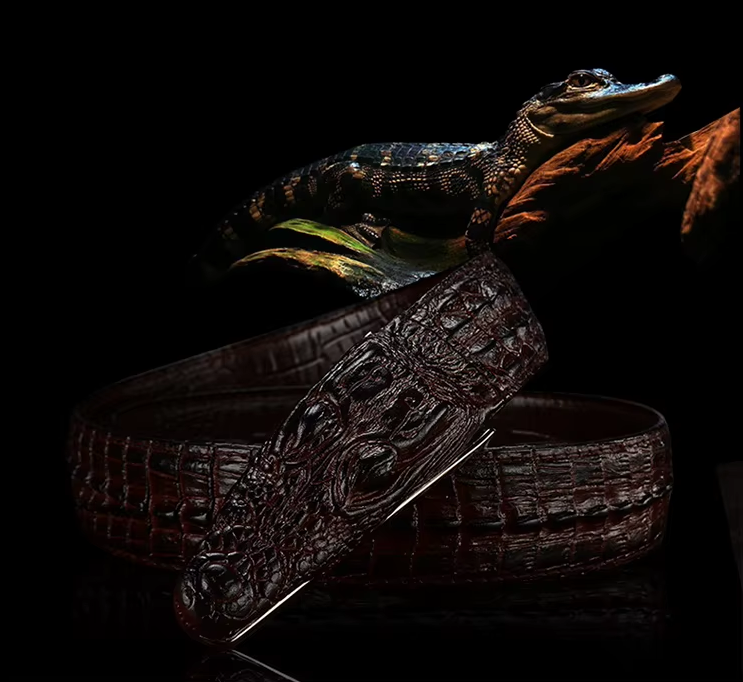 Выделяется оригинальным дизайном с пряжкой в форме головы крокодила и текстурой, имитирующей крокодилью кожу. Выполнен из комбинированных материалов: натуральной и искусственной кожи с металлическими элементами. Ширина ремня составляет 3,5 см, длина доступна в вариантах 110, 115, 120 и 125 см.
