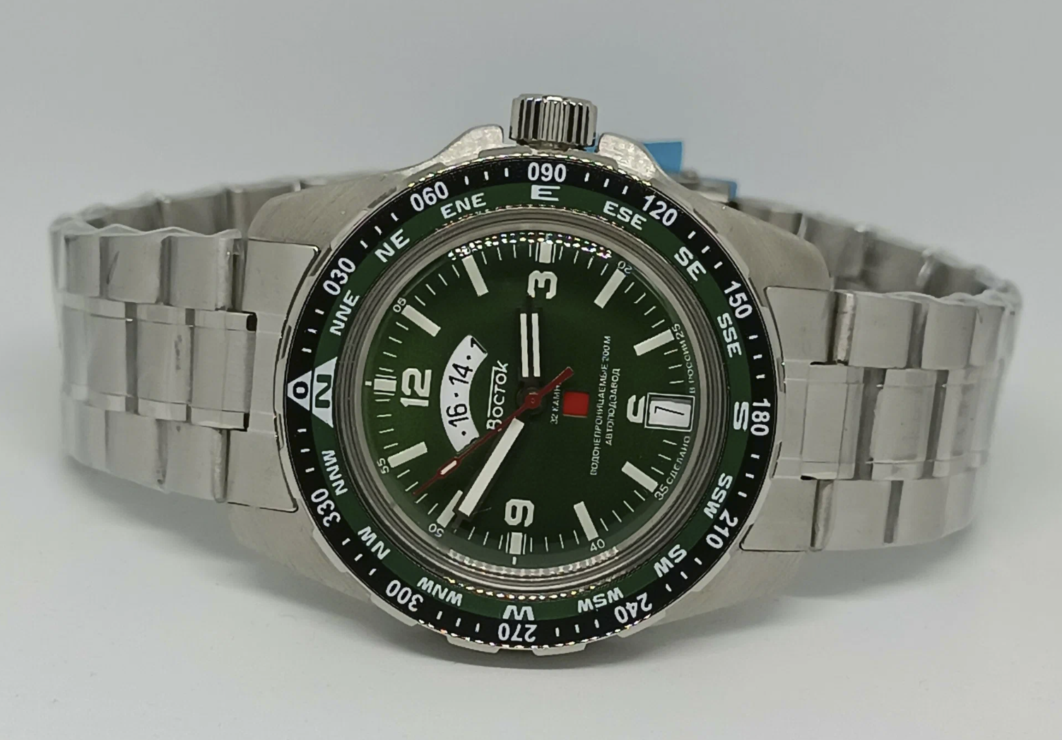 Плюс здесь стоит сапфировое стекло. Его сложно поцарапать даже при сильных ударах, а антибликовое покрытие позволяет видеть время под любым углом, даже на ярком солнце. Есть дата и день недели, а также люминесцентные стрелки, которые легко читать время в темноте.