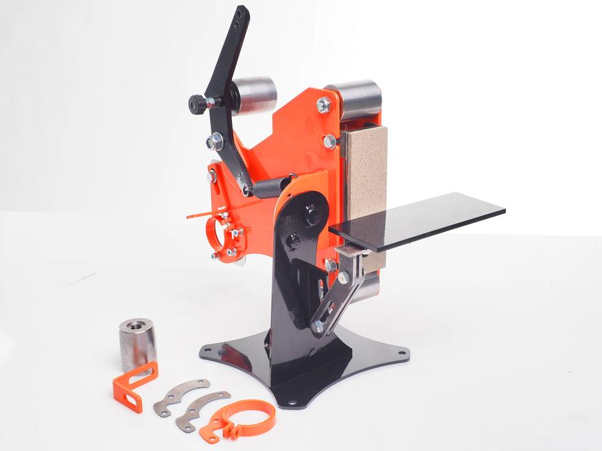 Гриндер представлен платформой с подвижной частью, крепежными деталями (есть варианты для М14 и М10), ручкой и тремя роликами, между которыми натягивается наждачная лента (шириной 20 или 40 мм).