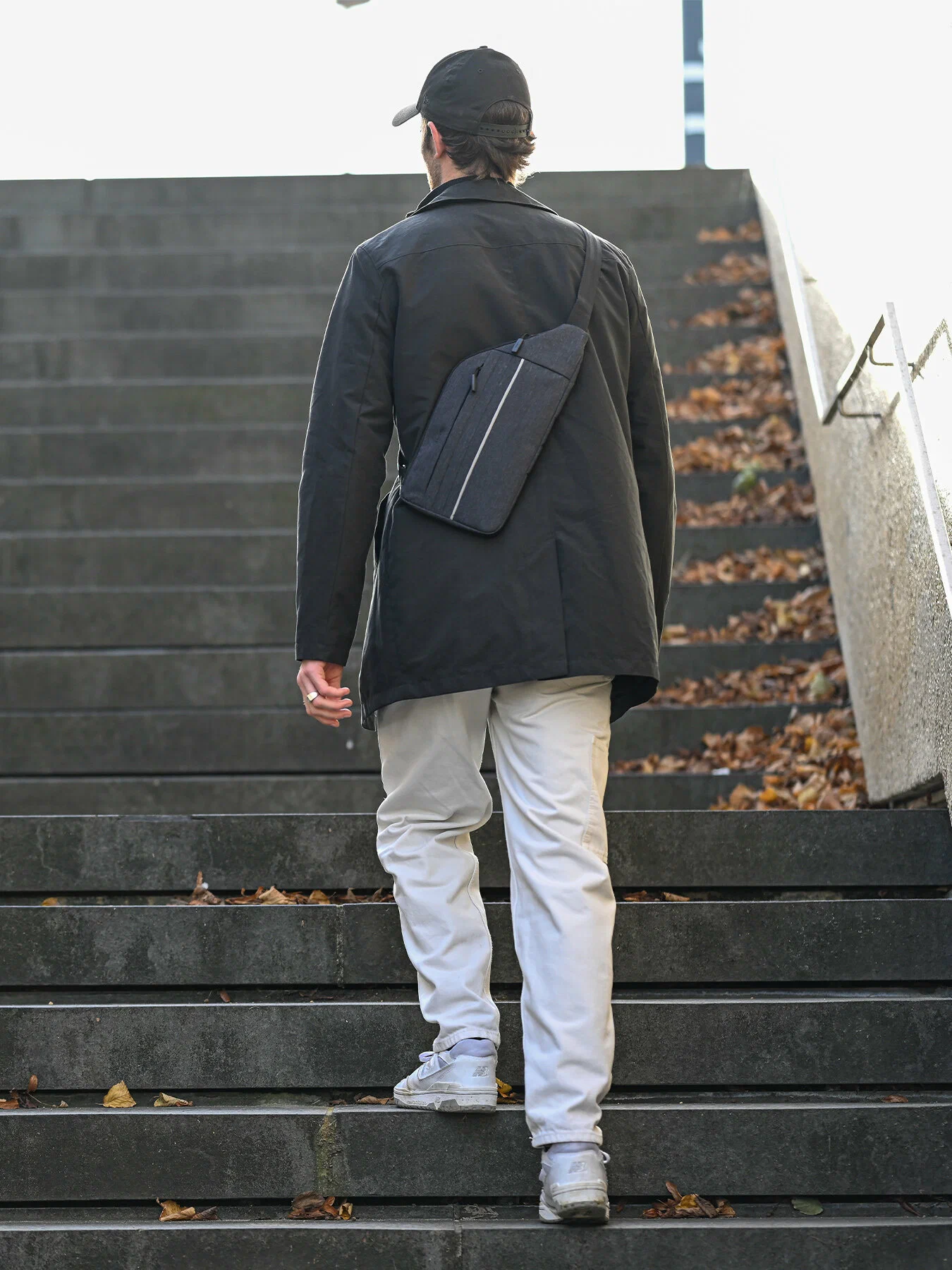 Особое внимание уделено безопасности: потайные молнии YKK, клапан с кнопкой, доступ к основному отделению со стороны спинки. Рюкзак выполнен из прочного рипстопа с водоотталкивающей пропиткой и фурнитурой из алюминия. Комфортно носится как на груди, так и на спине, легко перекидывается с одного плеча на другое. Размеры 37,5 x 14 x 18 см, умеренный вес в 430 г — разумный выбор для активного городского образа жизни и путешествий.