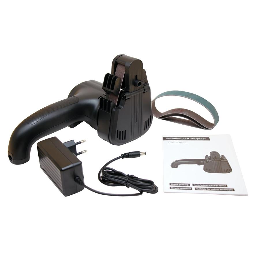 А это мобильная модель точилки с наждачными лентами, которая также работает от сети 220 В и подходит для ножей из керамики и металла.