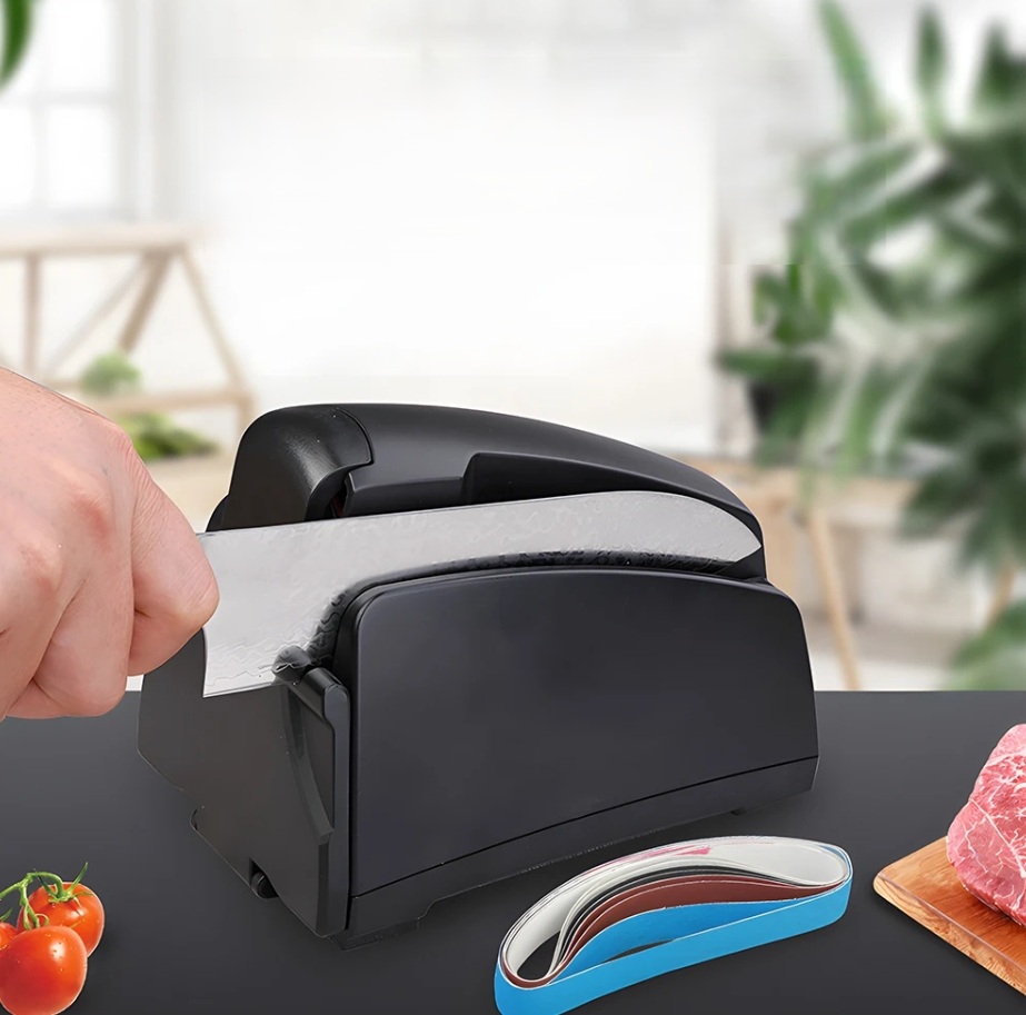 Завершает обзор электрическая точилка для ножей с зернистостью 120/320/600/1000. Это ленточная система с четырьмя сменными абразивными лентами разной грубости: от 120 (для сильных повреждений) до 1000 (для финишной полировки).