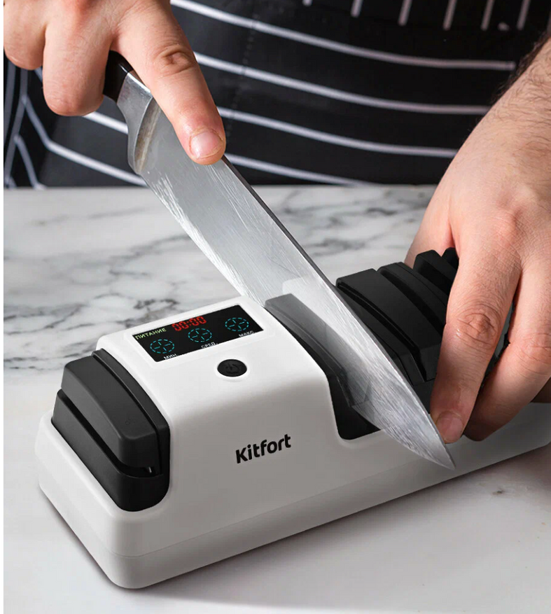 ZKS-915 работает быстро и чисто: вставил нож, провёл по трём этапам и лезвие снова острое, как в день покупки. Она не требует навыков, не дымит и не визжит, а просто делает свою работу. Отличный вариант, если хочется профессионального качества заточки дома, без лишних наворотов.