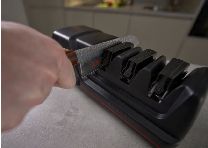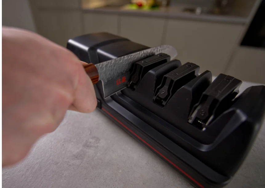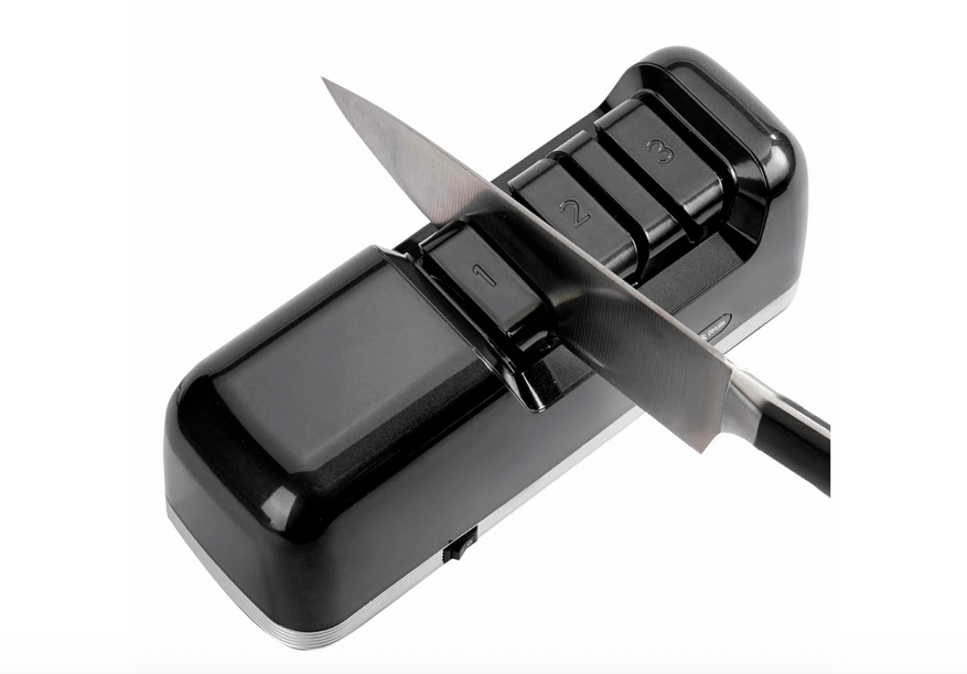 Эта модель быстро возвращает лезвиям нужную остроту без плясок с камнями и углами. Она справляется как с металлическими, так и с керамическими ножами, а компактный корпус позволяет держать её прямо на кухонной столешнице.
