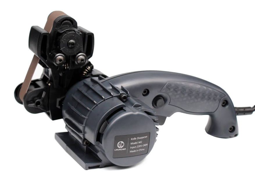 Пять абразивных ремней с разной зернистостью (P120, X65, X22, X4 и 6000 грит) работают поэтапно: сначала снимают металл, потом полируют до состояния, когда нож реально бреет волос. Две направляющие с кожаными вставками бережно удерживают клинок и не дают ему поцарапаться, а семь скоростных режимов позволяют точно контролировать процесс: медленно и аккуратно на черновом этапе, быстро и чисто на финише.