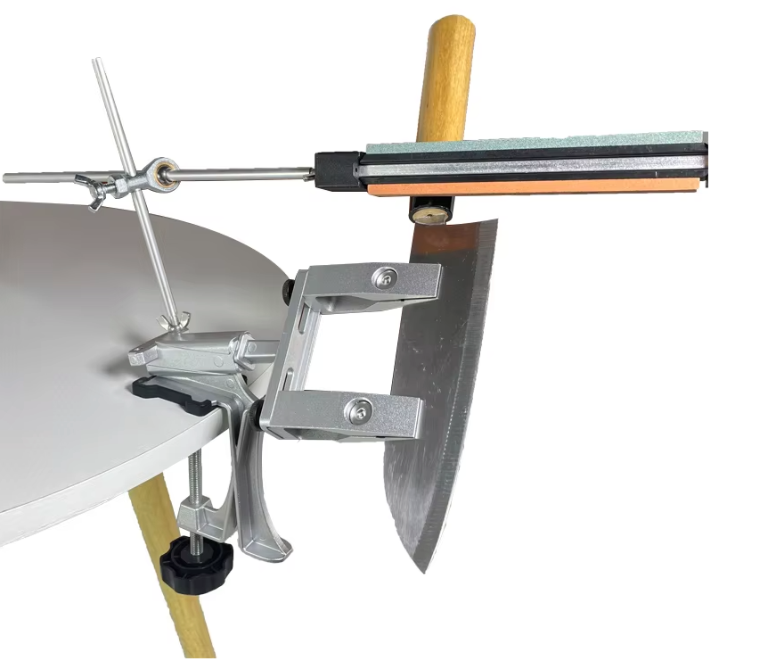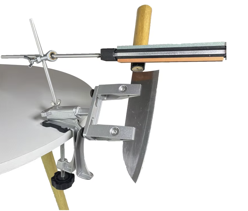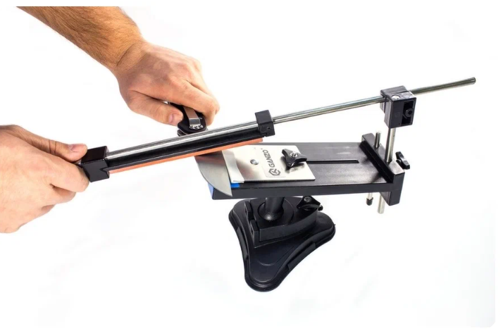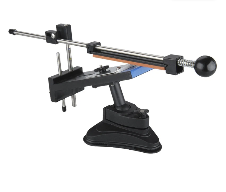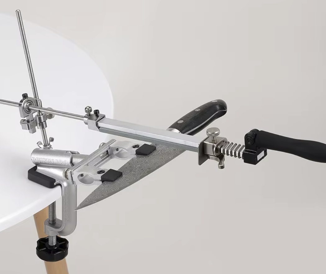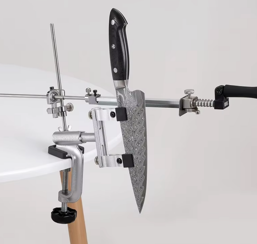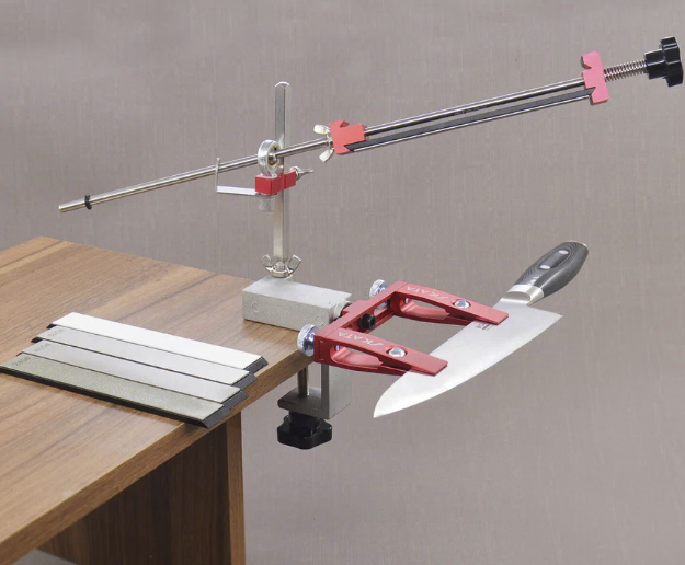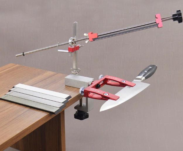 Основание крепится к столу и дополнительно имеет силиконовые противоскользящие элементы. Это убирает вибрации и смещение во время работы. Высота и положение держателя регулируются, поэтому система подходит как для небольших кухонных ножей, так и для более длинных клинков.