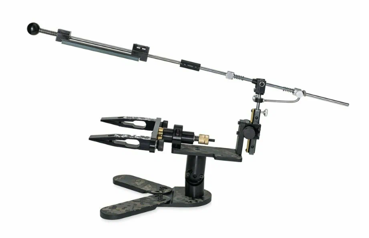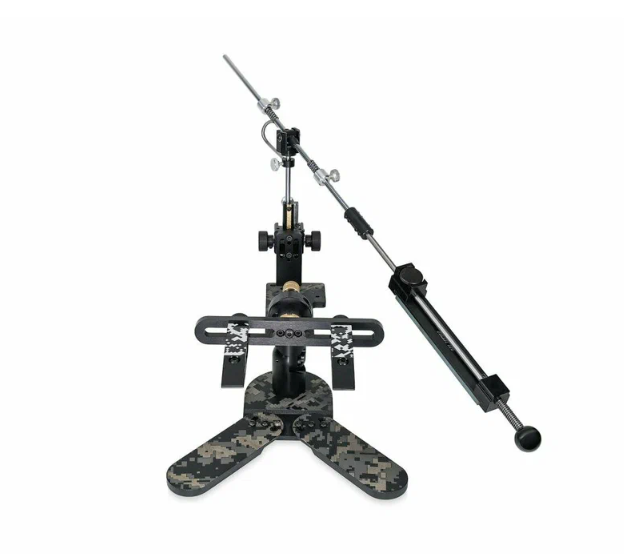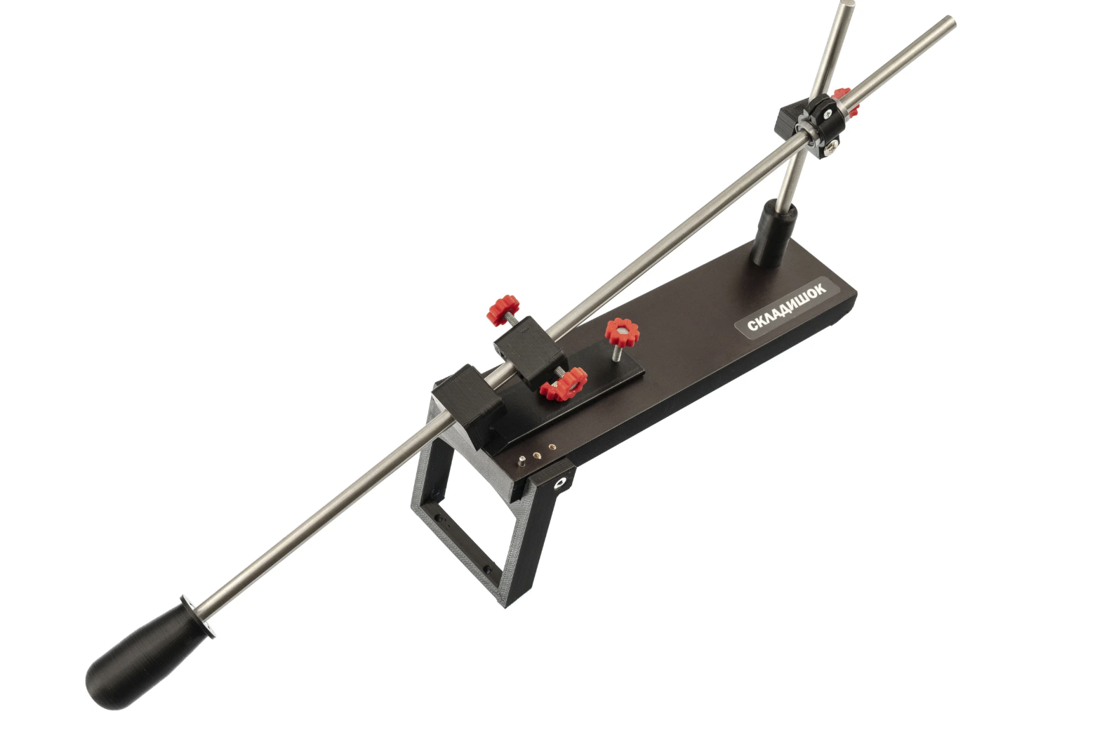 Это компактная система с поворотным узлом на 360° и жёстким зажимом клинка. Конструкция предельно простая по идее: нож фиксируется в держателе, абразив движется по направляющей штанге через шарнир, который задаёт постоянный угол на всём ходе.