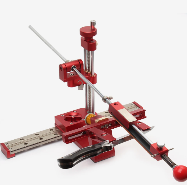 Зажим регулируемый, с подвижными губками, позволяет фиксировать как узкие кухонные ножи, так и более широкие клинки. Конструкция почти полностью металлическая, что даёт жёсткость и стабильность под нагрузкой. Направляющая работает на тефлоновых шаровых опорах, ход ровный, без рывков и залипаний.