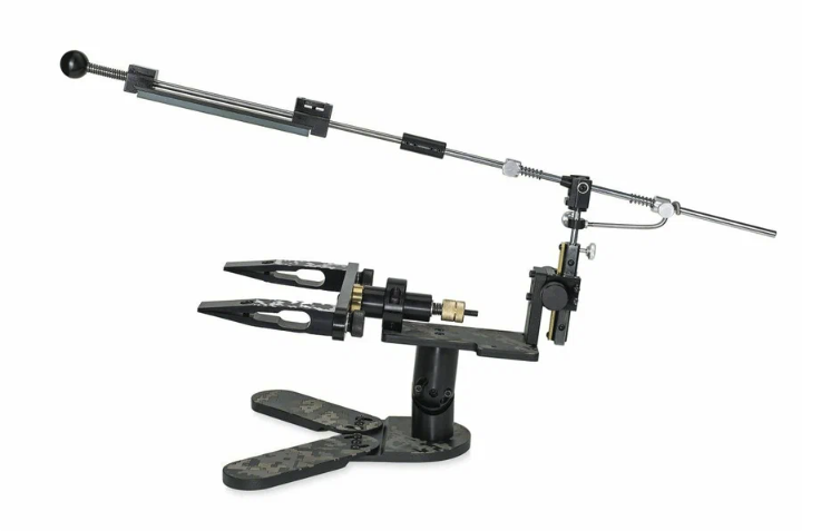 Это стационарная система с верхней направляющей, в которой весь контроль геометрии перенесён в механику. Нож закрепляется в держателе, а абразив движется по жёстко заданной дуге, поэтому угол не «плавает» от прохода к проходу и кромка формируется равномерно по всей длине.