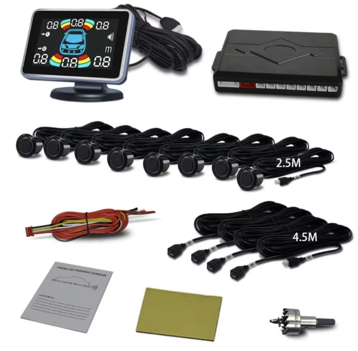 В комплект также входит коронка на 22 миллиметра для предварительного сверления бампера перед установкой датчиков. Также стоит отметить, что парктроник имеет действительно небольшой дисплей, размеры которого составляют 6.8х2.3 см. Это может быть плюсом для пользователей, которые не любят нагромождать торпеду своего автомобиля.
