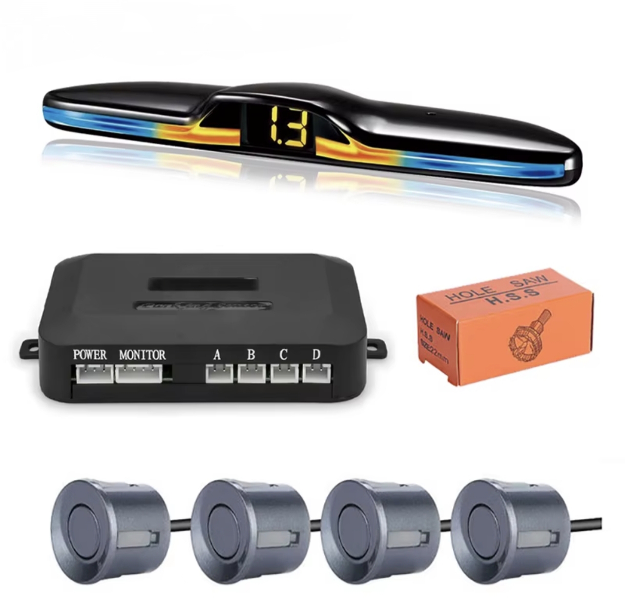 В комплект входит четыре датчика, блок управления, дисплей и коронка для сверления бампера под установку датчиков. Данные датчики также имеют диаметр 22 мм. Стоит отметить, что рабочий диапазон данной модели составляет от 30 см до 2 метров. Обратите внимание, что у данной модели срабатывание начинается на удалении от препятствия в 2 м, что я считаю оптимальным вариантом.