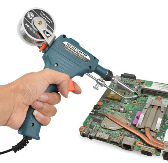 Далее хотелось бы вам представить модель паяльника в виде пистолета. Его мощность соответствует 60 Вт, в течение нескольких секунд жало нагревается до 400 ℃. Главный плюс паяльника — автоматическая подача припоя (достаточно нажать на курок, и процесс запустится). Поставляется с оловоотсосом и двумя пинцетами с антистатической функцией. Есть и катушка со стартовым набором припоя. Напряжение — 110 В /220 В.