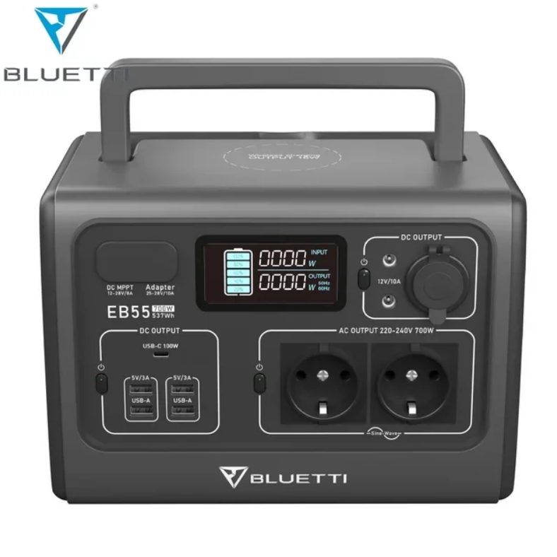 BLUETTI довольно известная компания среди производителей портативных электростанций, такой себе бюджетный аналог EcoFlow. С продукцией этой компании я знаком лично, так как уже больше года пользуюсь их моделькой начального уровня — Bluetti AC2P. Это маломощная станция, которую я брал ребенку для подстраховки во время дистанционного обучения (обзор тут). Но на какие-то серьезные потребители она конечно не рассчитана. Здесь лучше обратить внимание на более серьезную станцию BLUETTI EB55. Она обеспечивает мощность до 700W (в пике до 1400W) и оснащена аккумулятором на 537 Wh, а этого уже достаточно, чтобы организовать полноценное рабочее место, обеспечить себе досуг или приготовить покушать в условиях отсутствия электроэнергии. Сразу 2 розетки переменного напряжения, «автомобильный» разъем для поcтоянного напряжения и целый ворох USB разъемов (4 USB-A + USB-C). Есть разъем для подключения солнечных панелей, есть беспроводная зарядка для смартфона. Все виды подключений активируются отдельными блоками, а на экране вы можете видеть потребление и расчетное время работы. К тому же у BLUETTI есть хорошее приложение на смартфон, где удобно менять настройки и мониторить различные показатели.