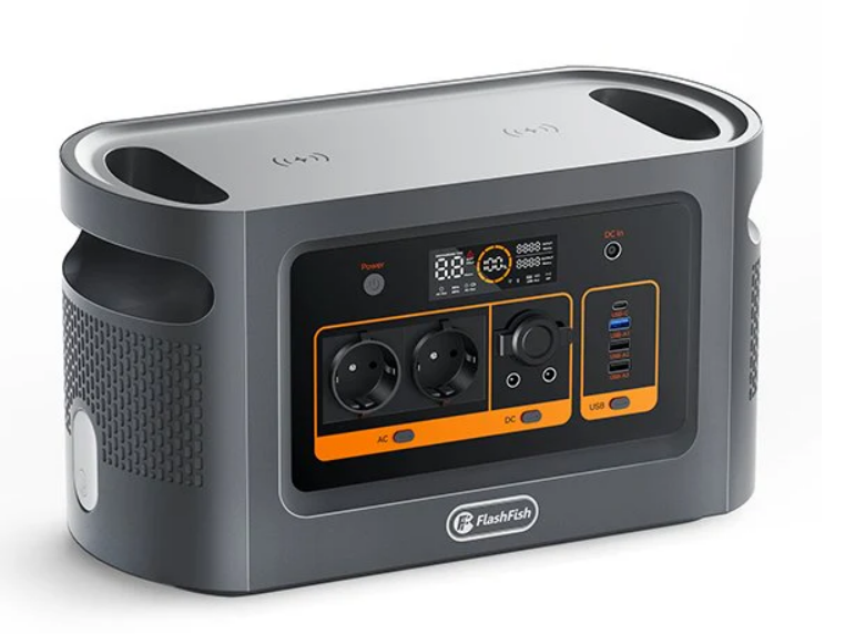 Ну, а теперь переходим к более серьезным решениям, которые имеет смысл рассматривать при длительных и частых отключениях электроэнергии. Настоящий топ по соотношению цены с характеристиками модель FF FlashFish QE02D. Эта станция с емкостью 1008 Wh может выдавать до 1200W мощности с чистой синусоидой. В пике выдаваемая мощность может быть увеличена до 2400W (до 30 секунд). Данная станция потянет не только телевизор или компьютер, но и более требовательные потребители, вроде холодильника, электрогриля или микроволновой печи. 2 розетки, прикуриватель и целый ворох USB разъемов. По USB-C выдает до 100W мощности, что можно использовать для питания ноутбука или быстрой зарядки своих устройств. Для смартфона есть площадка с беспроводной зарядкой и вторая площадка для беспроводной зарядки гаджетов (смарт-часы, наушники). На торце мощная светодиодная лампа, которую удобно использовать для аварийного освещения. На лицевой части разместили светодиодный экран, где отображается вся важная информация. Станция защищена от перегрева, перегрузки по току и напряжению, а также короткого замыкания.