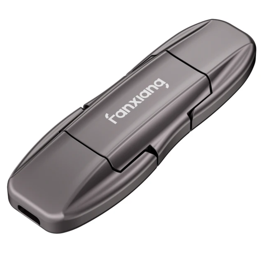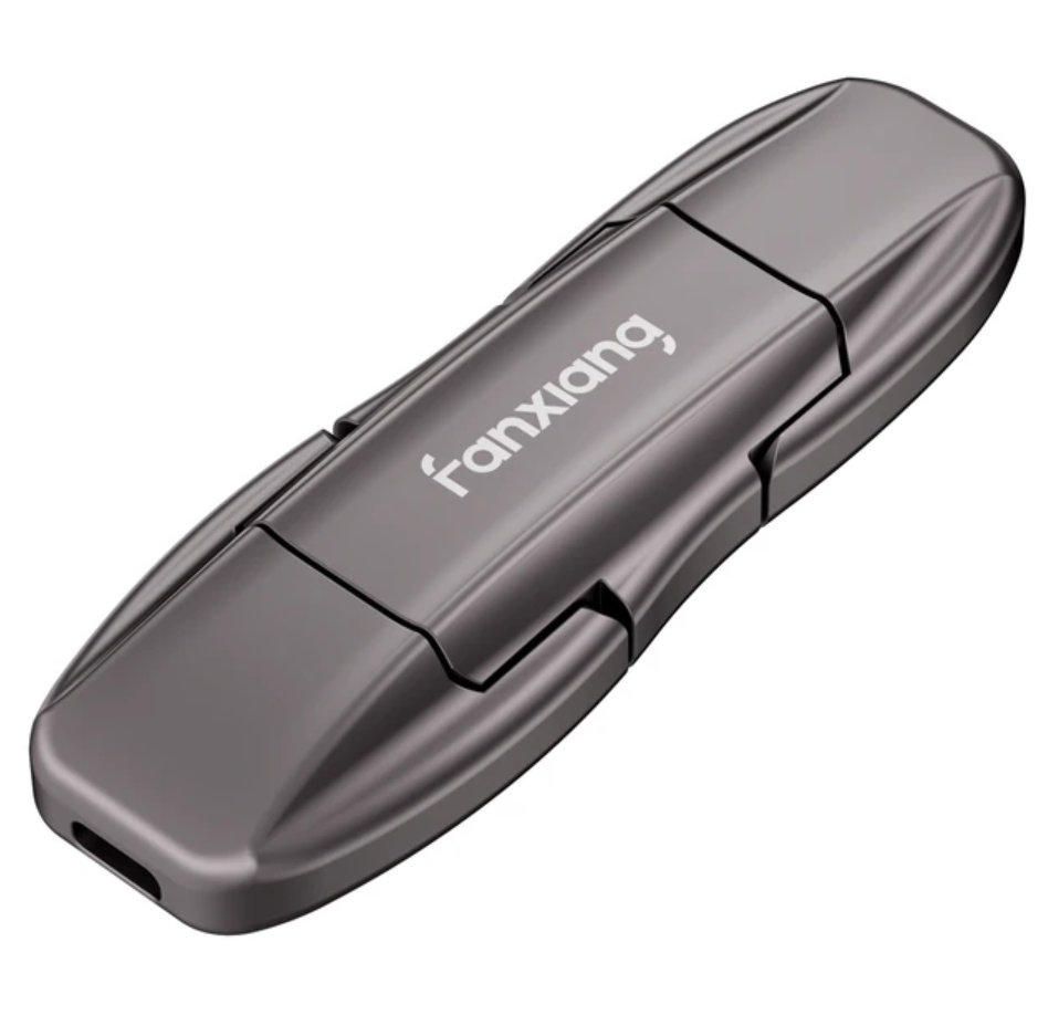 Эта увесистая флешка от довольно молодого китайского производителя Fanxiang достигает скоростей 1000 МБ/с и даже после исчерпания кэша продолжает копировать данные со скоростями 500 МБ/с. Она похожа по дизайну на предыдущую модель с открывающимися крышками разъемов USB-A и USB-C, но путать их не стоит, производители разные. Судя по отзывам греется не очень сильно.