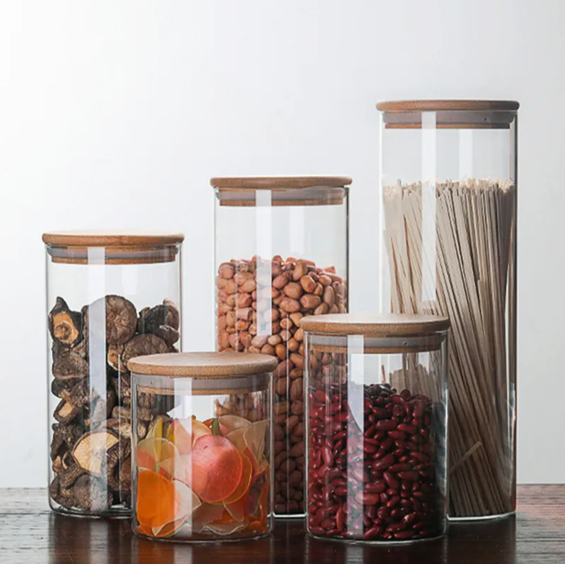 Ну и начнем сегодняшнюю подборку со стеклянных банок для сыпучих злаков/макарон с бамбуковой крышкой. Это довольно стильное решение для кухни, у которой есть открытая верхня полка.