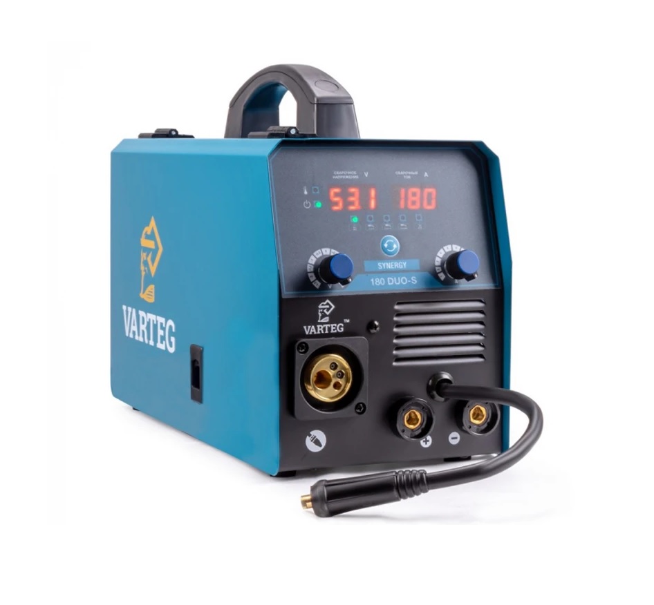 Компактный инвертор в стальном корпусе голубого цвета. Его стоит рассмотреть к покупке, если необходима «рабочая лошадка» для длительных работ. Аппарат характеризуется максимальной универсальностью: работает с электродом, проволокой (газ/без газа) и в режиме TIG-Lift. Как и предыдущая модель в подборке оснащён синергетическим управлением. Два ЖК-дисплея отображают ток и напряжение, а «мягкая» регулировка в пределах двух вольт поможет удобно контролировать глубину провара, форму и прочность шва. Varteg 180 DUO-S подойдёт для сварки металлический профилей, ремонта кузова и других задач, где важны надёжность и точность при малых габаритах.