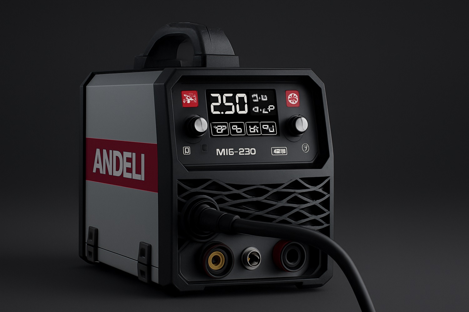 Многофункциональная модель с хорошими отзывами на маркетплейсе Aliexpress. Она уже довольно долго выпускается, и, судя по отзывам, хорошо себя зарекомендовала. Маленьким недостатком является отсутствие экрана. Это моё небольшое субъективное мнение (просто уже привык к такой опции). Тем не менее аппарат оснащён интеллектуальным контроллером, автоматически подстраивающим параметры под условия работы, что, по сути, есть так называемое «синергетическое управление». Имеется несколько систем защит от перегрева, короткого замыкания и скачков напряжения. Работать можно как в режиме дуговой сварки, так и полуавтоматом в среде защитных газов либо с порошковой проволокой. Максимальный ток — 160 А.