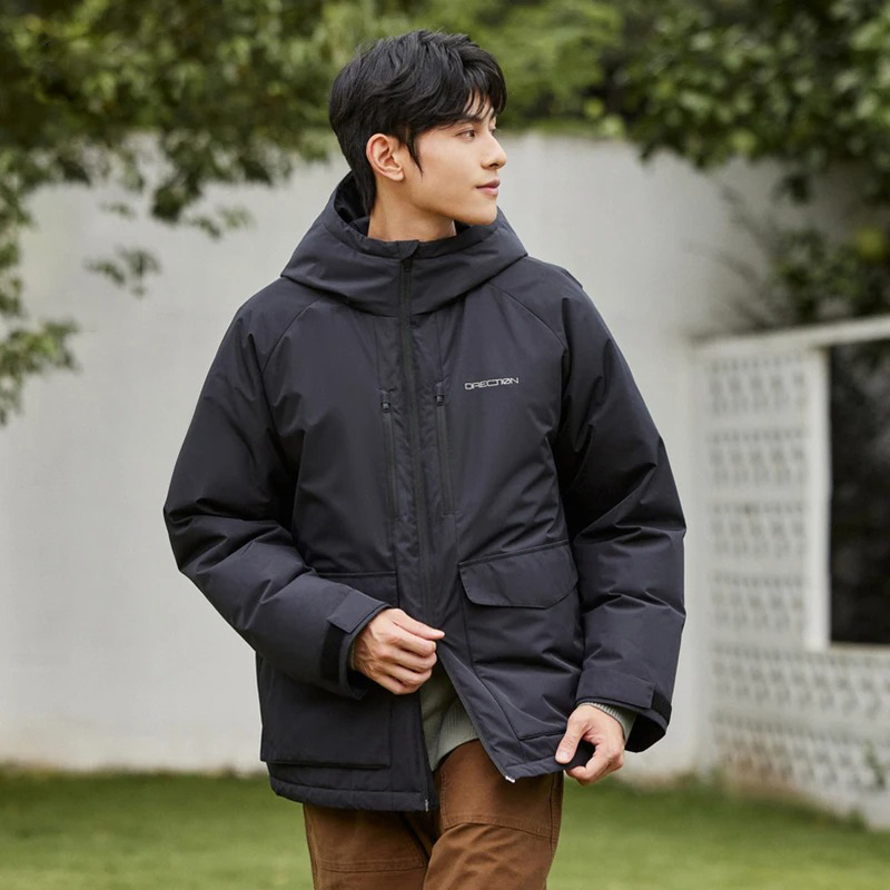 Состав ткани: прочный полиэстер снаружи, серый утиный пух в качестве утеплителя (прошит) и гладкая подкладка внутри, молнии защищены от воды, а под центральной расположили ветрозащитный клапан.
