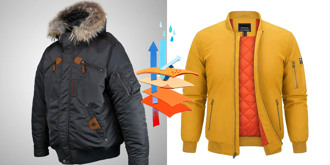 Состав ткани: толстый нейлон, внутри — синтепоновый наполнитель (прошит) с контрастной подкладкой, есть защита от дождя и ветра (в том числе двойным центральным клапаном).