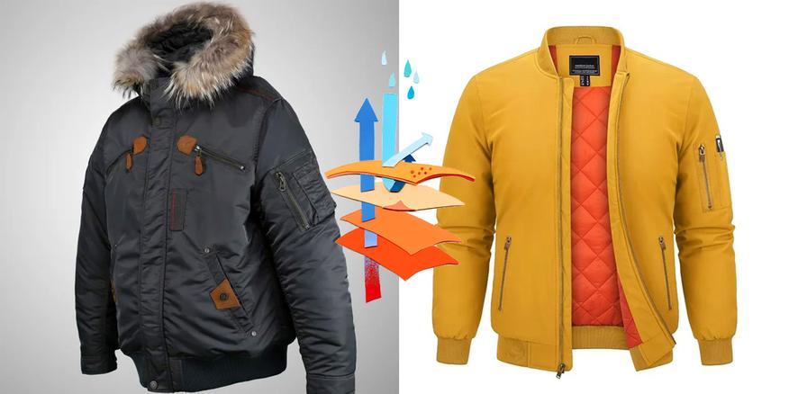 Состав ткани: нейлон, полиэстер, синтепоновая стеганая подкладка, снаружи материал защищен от дождя и ветра, в том числе есть центральный клапан и не пропускающие влагу наружные молнии.