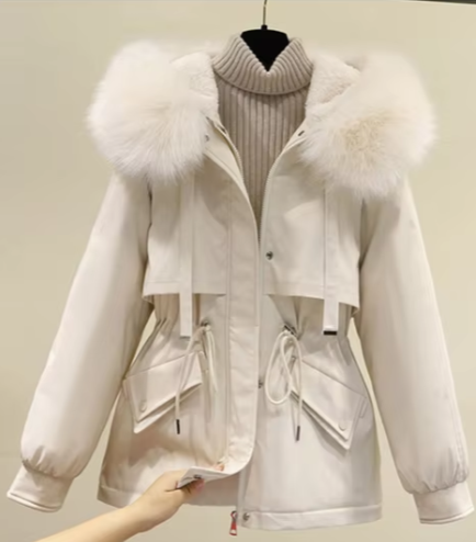 Женская зимняя куртка выполнена из стеганого хлопка с наполнителем, обеспечивающим тепло. Верхняя часть изделия оснащена капюшоном с густым искусственным мехом. Куртка застегивается на молнию и кнопки, на талии предусмотрены утяжки для регулировки. Модель имеет два больших кармана и подкладку из искусственного меха для дополнительного утепления. Куртка свободного кроя, комфортно сидит даже с тёплым свитером под ней, длина немного прикрывает бёдра. Подходит для температуры до -20°C.
