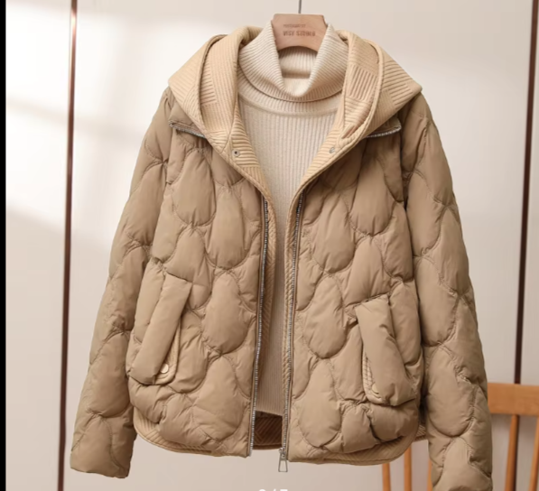 Женская зимняя стёганая куртка выполнена в стиле свободной парки с капюшоном. Зауженный крой подчёркивает фигуру, визуально уменьшая линию плеч. Длина куртки — примерно на 10 см выше колена. Материал немного блестит, но без излишнего глянца. Куртка лёгкая по весу, но при этом сохраняет тепло. Рукава стандартной длины, удобные в носке.