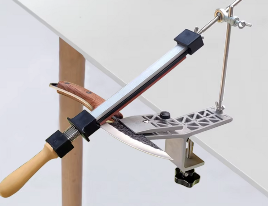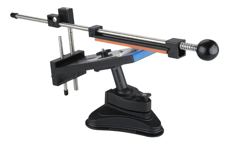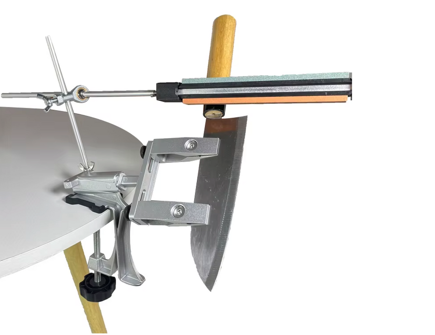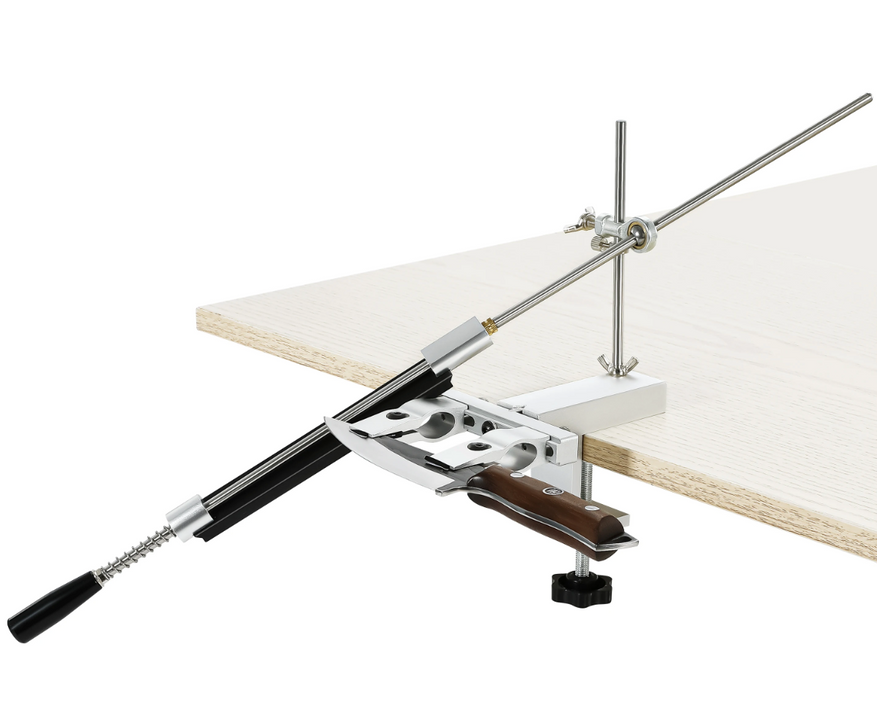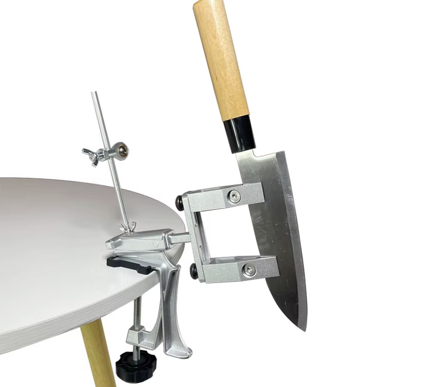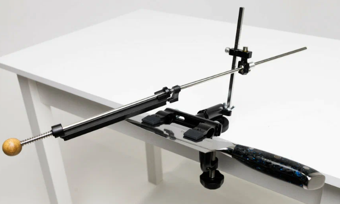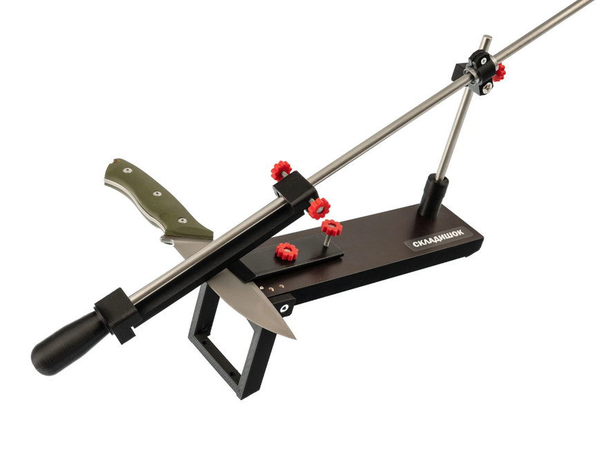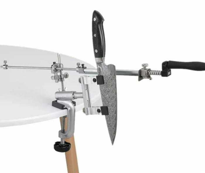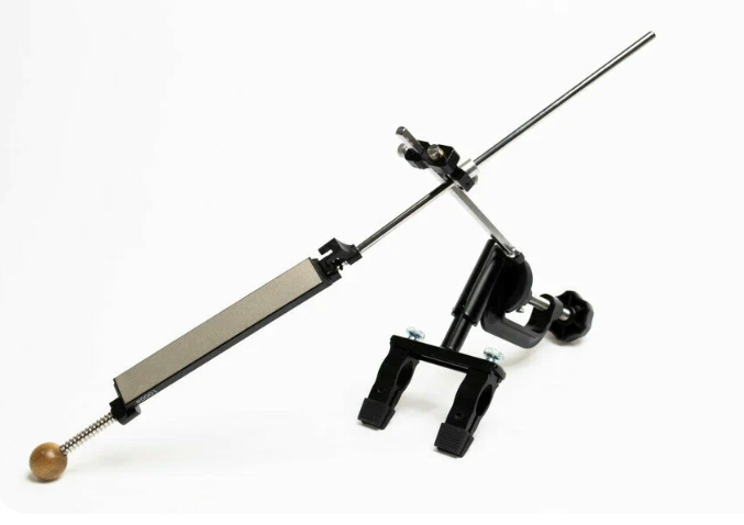 Ручная система с креплением к столу через струбцину, зажимом для клинка и направляющей для абразива. Конструкция состоит из металлического основания, вертикальной стойки и держателя камня. После фиксации кромка ножа располагается ниже уровня рукоятки и рабочей зоны.