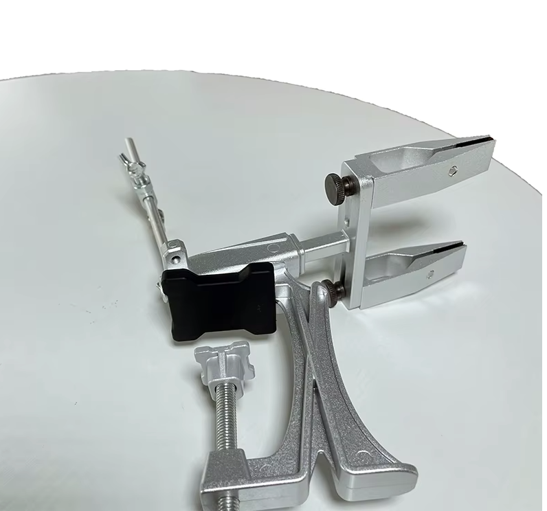 Основание выполнено из металла. Снизу установлены резиновые вставки и присоска для фиксации на столе. Конструкция разборная, элементы можно снять для хранения или транспортировки.