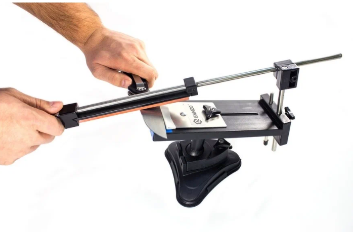 Система с зажимом для ножа и направляющей штангой для камня. Клинок фиксируется в держателе, абразив перемещается по одной линии. Геометрия кромки сохраняется за счёт направляющей, без ручного удержания угла.