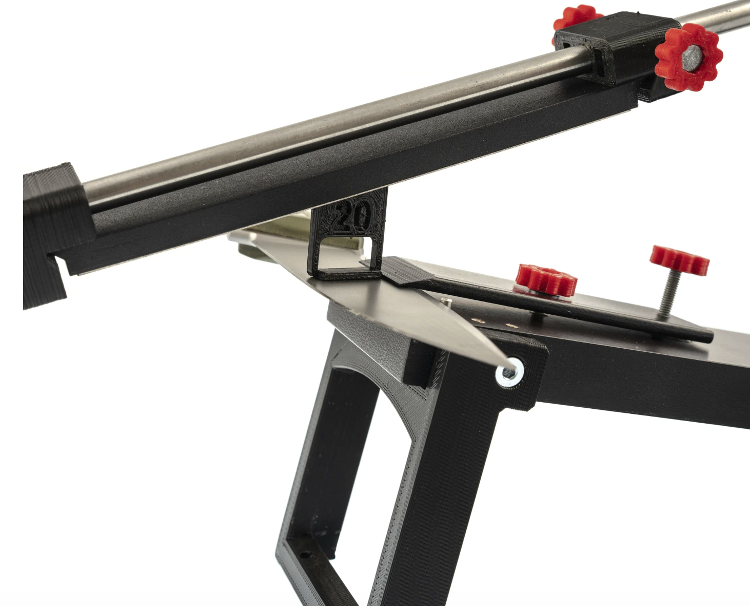 Настольная направляющая система с алюминиевым корпусом, зажимом для клинка и держателем абразивов. Основные элементы выполнены из металла, без пластиковых нагруженных деталей. Конструкция цельная, с жёсткой рамой и фиксированной геометрией.