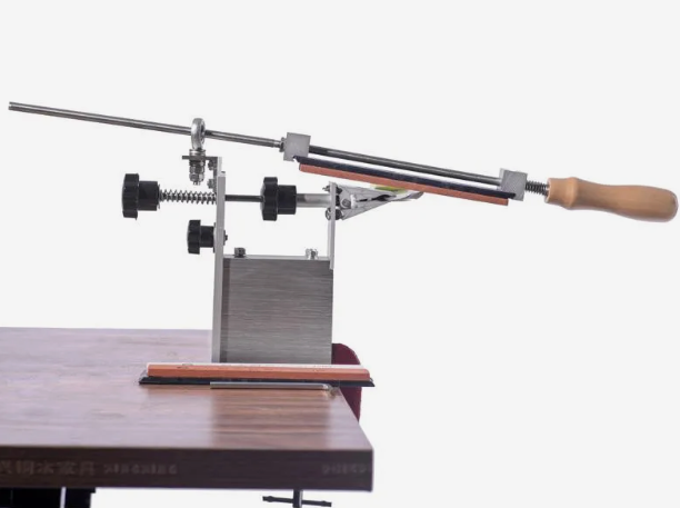 Настольная система с металлической рамой, зажимом для клинка и направляющей для абразива. Нож устанавливается неподвижно, рабочий элемент перемещается вдоль режущей кромки. Угол формируется положением направляющей и сохраняется одинаковым на всём протяжении движения.