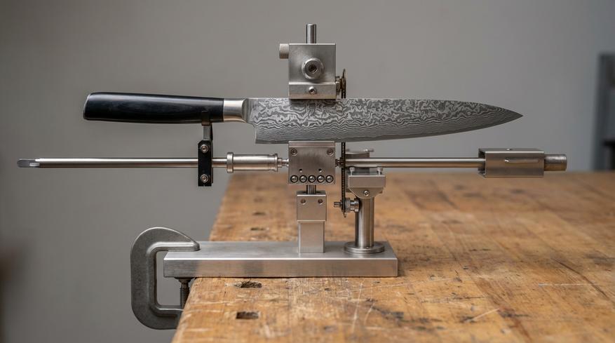 Нож закрепляется в зажиме. Абразив установлен на держателе и перемещается по направляющей штанге. Движение идёт по заданной траектории, поэтому угол сохраняется постоянным по всей длине кромки. Металл снимается равномерно, без изменения геометрии.
