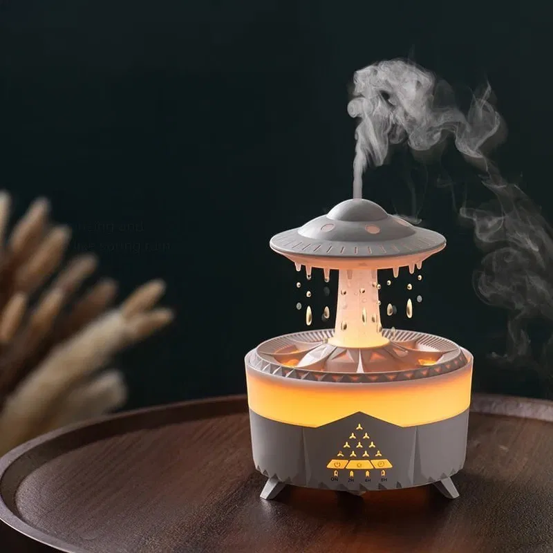 Необычный настольный увлажнитель в виде дождевого облака с имитацией капель, LED-подсветкой и звуковым эффектом дождя. Объём резервуара 350 мл, расход влаги до 30 мл/ч, бесшумная работа (менее 36 дБ), автоотключение при нехватке воды. Управление дистанционное, предусмотрен таймер на 2/4/8 часов. Питание 24В через USB, мощность — 5 Вт. Размер 145 x145 x189 мм. Подходит для помещений от 20 до 60 м². В комплекте пульт, кабель, инструкция. Поддерживает смену режимов подсветки и используется также как арома-диффузор.