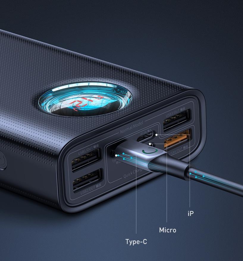 Еще один мощный аккумулятор емкостью 30 000 мАч, который одновременно способен заряжать пять устройств. Гаджет оснащен семью портами, три работают на вход (micro USB, Lightning, Type-C) и пять на выход (3xUSB 2.0, 1xUSB QC 3,0, Type-C PD 3.0) под разные кабели. Поддерживает технологию быстрой зарядки с мощностью 18 Вт. Оснащен небольшим дисплеем, на котором можно отслеживать уровень заряда и мощность.
