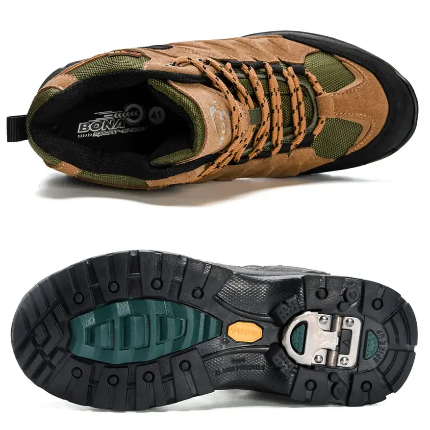 Ключевой особенностью этих ботинок от Bona является складная система с металлическими шипами на подметке, которые улучшают сцепление на льду. Верх выполнен из искусственной кожи, а область носка и задник усилены дополнительным слоем полиуретана.
