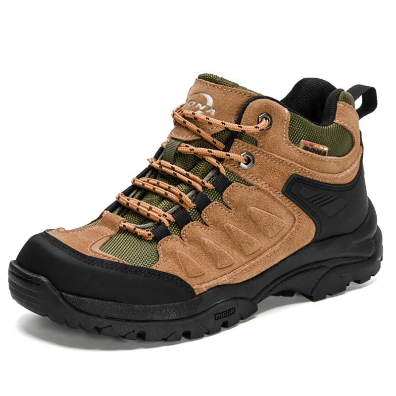 Ботинки Golden Camel сочетают синтетическую кожу из микрофибры с эластичными сетчатыми вставками в области воротника, что обеспечивает воздухопроницаемость и износостойкость. Высокий верх с классической шнуровкой и металлическими люверсами надёжно фиксирует голеностоп, а съёмная стелька из латекса и текстильной сетки обладает эффектом памяти и создаёт комфорт при длительных переходах. Внутренняя отделка выполнена из дышащей сетки.