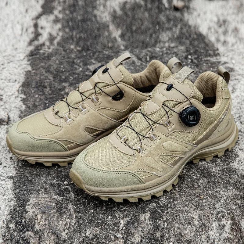 Верх выполнен из комбинации синтетической кожи и дышащей сетки. Характерная деталь — защитный кожух в виде тентового клапана, который фиксируется пряжкой на липучке и скрывает шнуровку. Носок и боковая часть усилены контрастными накладками для защиты от грязи и брызг воды, делая кроссовки готовыми как к городским улицам, так и к трейловым маршрутам.