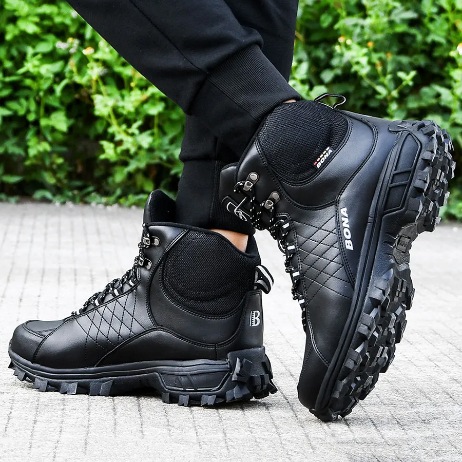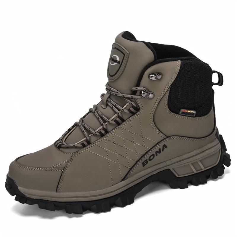 Открывают подборку BONA 35528 — это универсальные мужские походные ботинки для межсезонья: кожаный верх сочетает плотную защиту с вставками из дышащего материала у воротника, помогая ноге не перегреваться в длительных переходах. Классическая шнуровка фиксирует среднюю (B/M) колодку без давления на подъем.