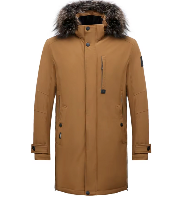 Куртка имеет съемный капюшон и меховой воротник, который можно легко снять, если захочется изменить образ или адаптироваться к погоде. Плотный материал верха защищает от ветра и лёгкого дождя, удлинённый крой помогает сохранить тепло и закрывает поясницу — идеальное решение для комфортного передвижения в прохладную погоду.