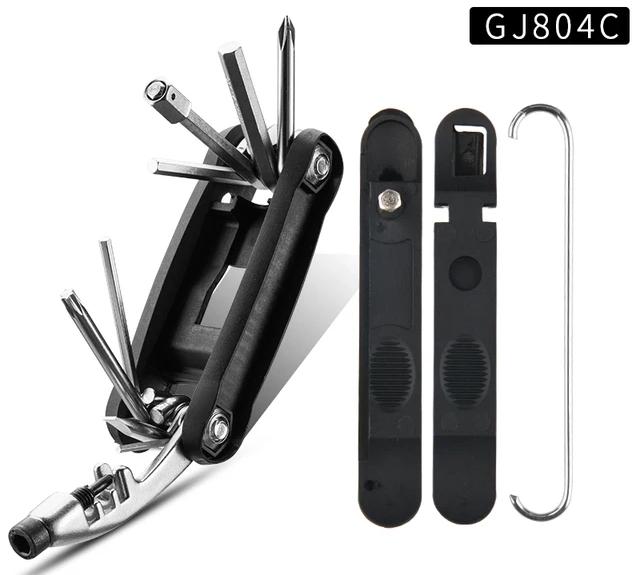 Инструмент от известного китайского производителя велосипедных аксессуаров ROCKBROS. В модели GJ804C заявлено 12 функций, а особенностью конструкции являются съемные боковины корпуса (но пластик полиамид P66), которые используются как монтажки для снятия покрышек, рукоятки для выжимки, крючок для цепи. В остальном, там обычный минимально необходимый набор ключей (материал закаленная сталь). Шестигранники до 8 мм, есть ключи для регулировки спиц.
