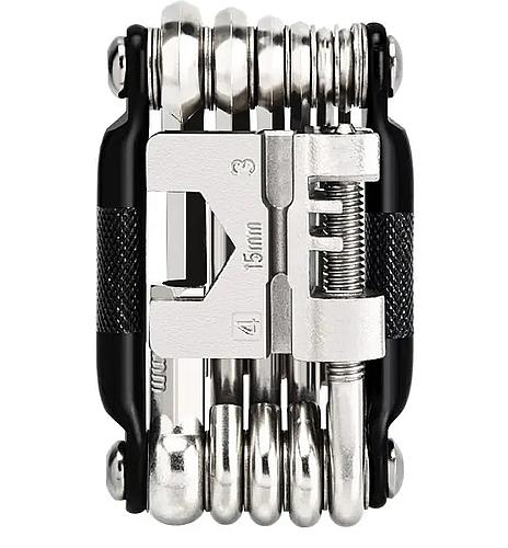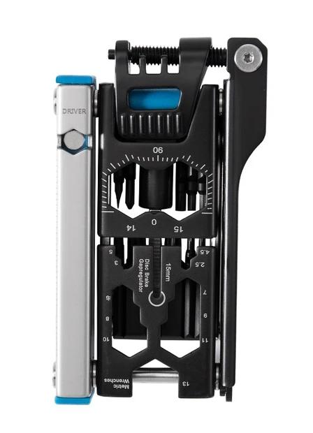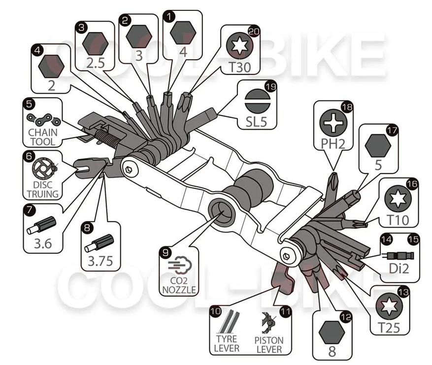 Мультитул от известного японского производителя трансмиссий SHIMANO. Тут (PRTL0134 на 20 функций) собранные в одном корпусе довольно редкие и специфичные инструменты (например, переходник с CO2 баллона на ниппель колеса или ключ для Di2). Но инструменты довольно короткие. Шестигранники с 2 по 8 мм, есть монтажка для покрышек, и ключи для спиц 2 размеров. Выжимка подходит для 12 скоростной трансмиссии.