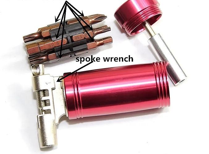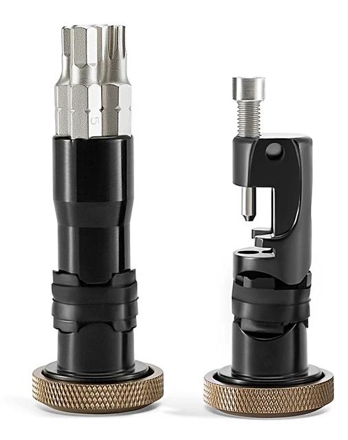 Одна часть включает мощную выжимку цепи (подходит для 12-скоростной цепи), вторая набор бит (4 шт. из закаленной стали) и отвертку с битодержателем. Торцевые заглушки выполнены из алюминиевого сплава. Чтобы части не болтались в руле предусмотренные резиновые уплотнения. Масса частей инструмента 28 и 47 г.