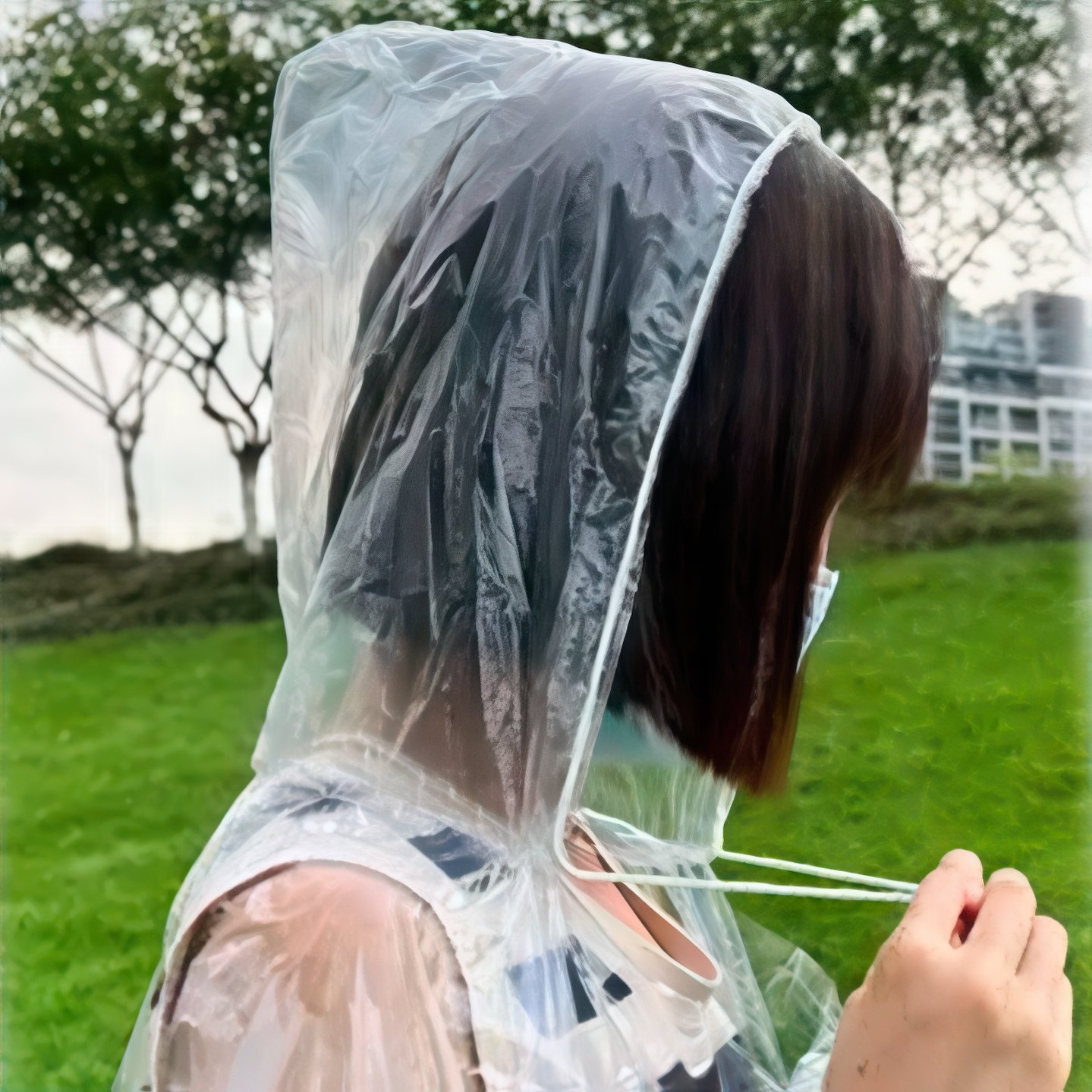 Во-первых, материал. Здесь используется более толстая прозрачная плёнка, что уже само по себе говорит о повышенной прочности. Но главная «фишка» — это капюшон со встроенным шнурком. Потяните за него, и передняя часть капюшона плотно обтянет ваше лицо, не давая воде проникнуть внутрь. Это особенно актуально при сильном ветре или косом дожде.