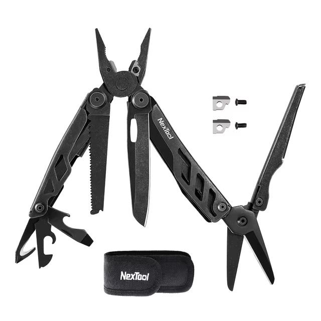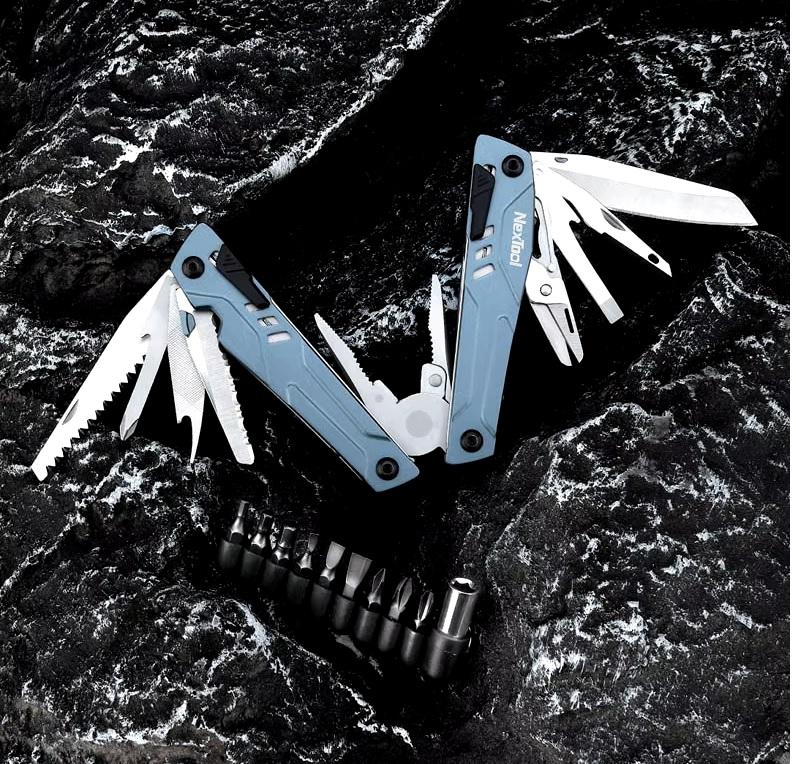 Бюджетный мультитул от бренда NexTool. Инструмент включает в себя четырнадцать различных компонентов: прямой и серрейторный нож, пилу, две отвертки, пассатижи, бокорезы и прочее.
