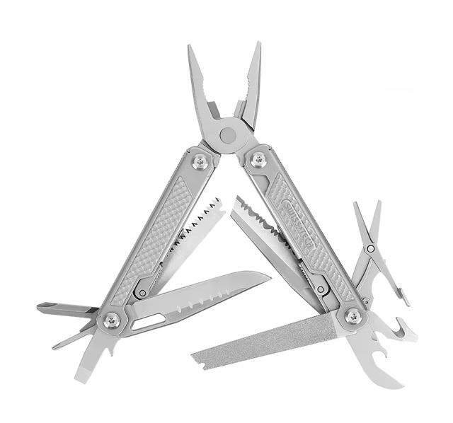Компактный мультитул 14 в 1 с весом 263 грамма. Отличительной особенностью этой модели является наличие широкого ножа с фиксатором, а также свисток.