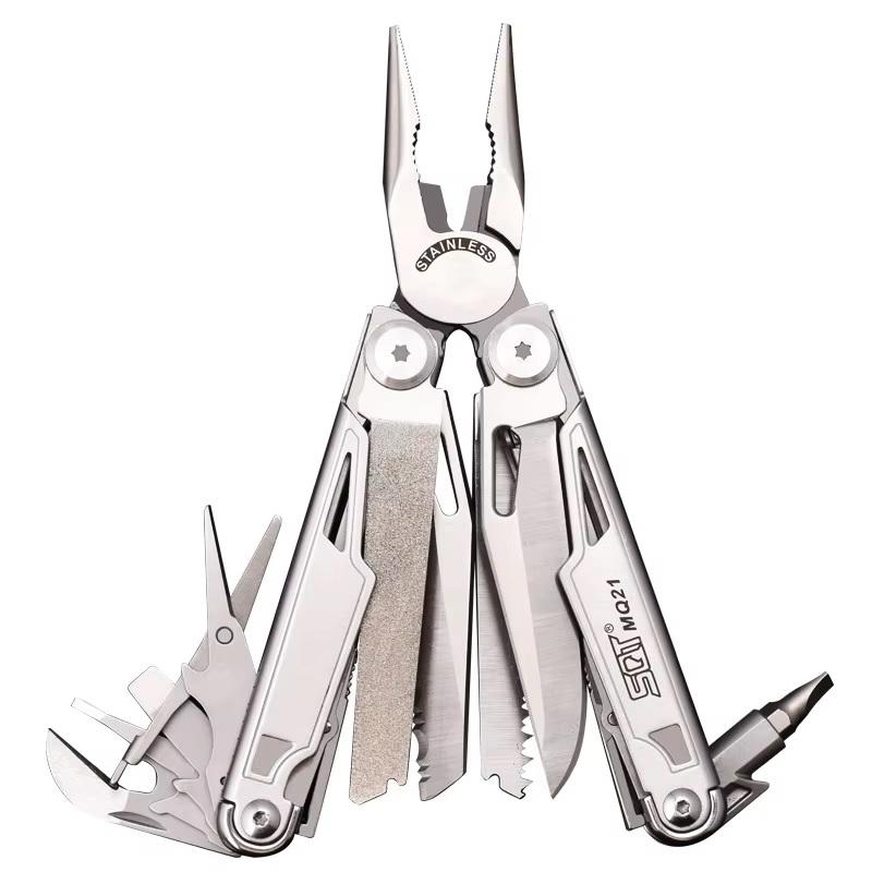 Открывает подборку мультитул, сочетающий в себе 37 различных инструментов. Изготовлен из стойкой к коррозии нержавеющей стали 3Cr13. Однако для производства ножа была применена другая марка стали — 7Cr17, обеспечивающая клинку остроту кромки и высокую износостойкость.