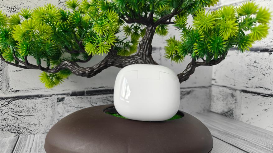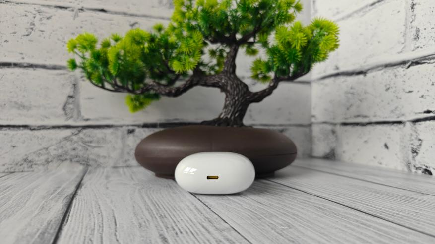 Кейс наушников выполнен по всем традициям подобных моделей — это полностью скруглённый пластиковый корпус. Пластик кейса — глянцевый белый. На лицевой стороне нанесен едва заметный логотип бренда. На нижней половинке заметен индикатор статуса работы.