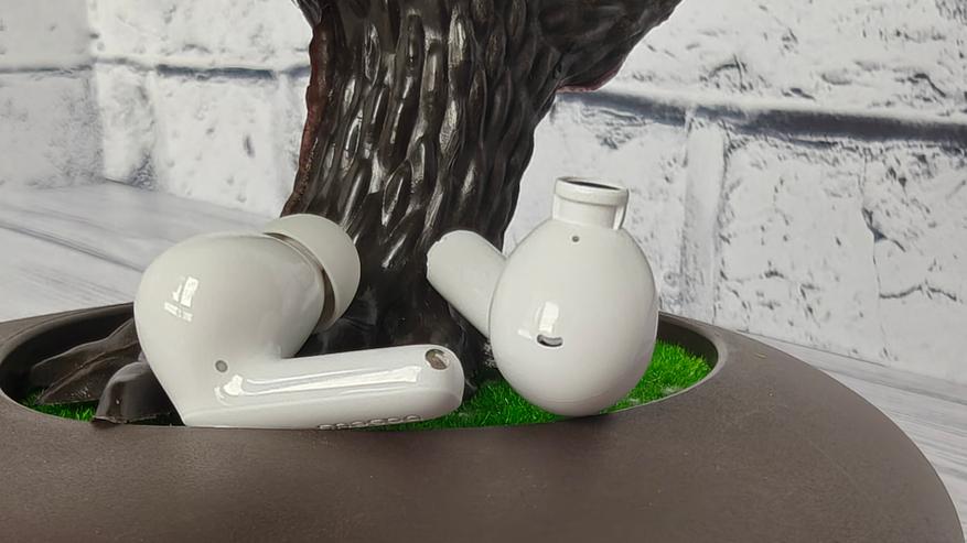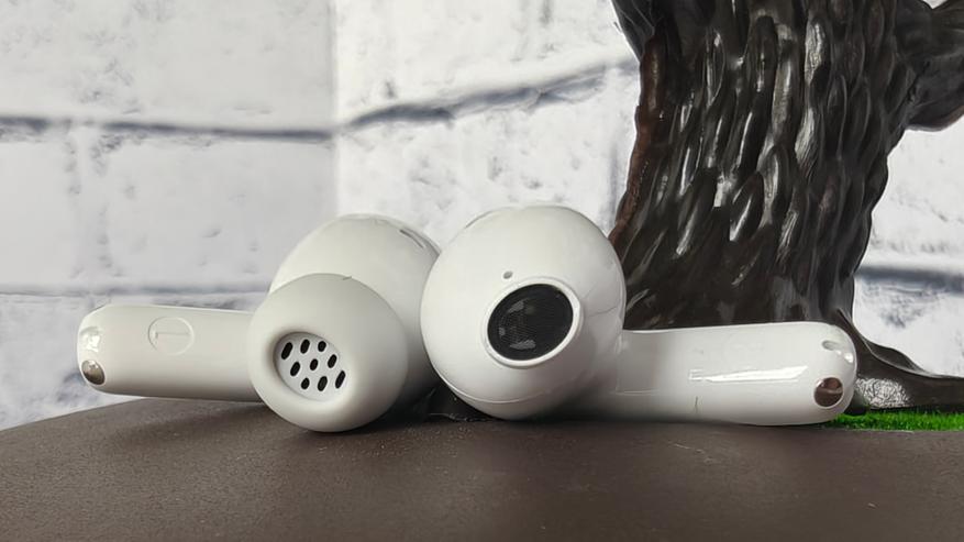 Наушники выполнены в традиционном исполнении — это капельки с ножкой и головкой, на звуководы которых надеваются силиконовые амбушюры. Каналы звука (левый и правый) заметно выгравированы на внутренней стороне ножки. Амбушюры дополнительно защищают звуководы силиконовой сеткой.